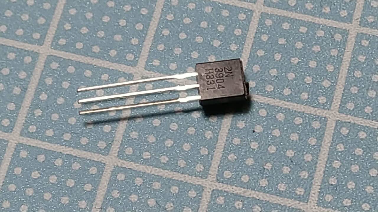 NPNトランジスタ2N3904。日本では、2SC1815を工作に使うことが多い。しかし2SC1815は製造中止しているし、更に2SC型番は日本のものなので、海外ではあまりポピュラーではない。